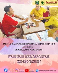 Bakti sosial dalam rangka Hari Jadi Kab. Magetan yang Ke 350 Tahun dilaksanakan pemeriksaan Katarak dan Pterygium di Puskesmas Kawedanan yang dilaksanakan Senin 06 Oktober 2025 dengan persyaratan membawa fotocopy KTP untuk semua usia dan tidak ada batasan wilayah . Dengan dihadiri 2 petugas dari Klinik Mata EDC di bantu 1 Petugas Puskesmas dan dihadiri 48 orang dari berbagai wialayah . Kegiatan bakti sosial ini sangat di sambung antusias masyarakat . Kegiatan diawali pendafatran dengan pengisisan nama, umur dan alamat setalah itu dilakukan skrining dari pihak Klinik EDC Magetan apabila memerlukan tindakan dari hasil skrining yang telah dilakukan maka akan dirujuk ke klinik untuk dilakukan konsultasi lebih lanjut. Bakti sosial yang dilakukan sangat bermanfaat dan sangat menarik antusias dari masayarakat harapannya bakti sosial terus dilaksanakan tiap tahunya.